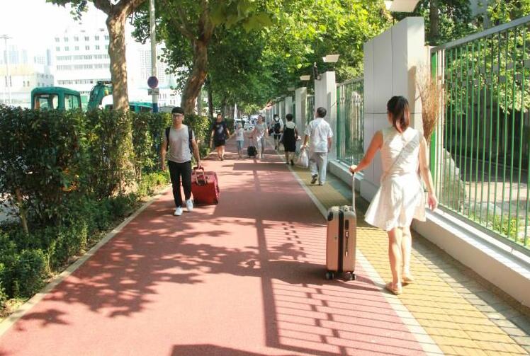 7月20日,濟(jì)南火車站東西進(jìn)出站通道兩側(cè)的人行道花磚鋪設(shè)一新,進(jìn)出站口兩側(cè)彩色瀝青宛如紅色地毯,深紅色的路面與綠樹相映,形成了一道靚麗的風(fēng)景線。這道靚麗風(fēng)景線的背后,是同晟路橋相關(guān)人員15個(gè)日日夜夜的辛勤汗水。