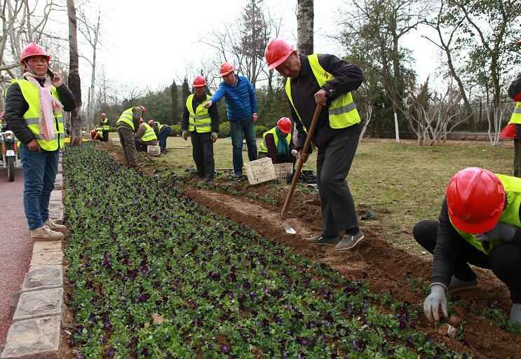 自2017年3月11日下午,由建設(shè)單位、市園林局、設(shè)計(jì)單位、監(jiān)理單位、施工單位根據(jù)現(xiàn)場實(shí)際情況確定施工方案后,濟(jì)南黃河路橋建設(shè)集團(tuán)有限公司立即組織人員、材料、機(jī)械進(jìn)場為施工做準(zhǔn)備,當(dāng)晚七點(diǎn)進(jìn)場施工人員15人,小型挖掘機(jī)一臺,對施工區(qū)域種植土進(jìn)行整理深耕,為栽植苗木做準(zhǔn)備。當(dāng)天夜間100000株時(shí)令花卉進(jìn)場(三色堇、雛菊),同時(shí)組織260余名施工人員對進(jìn)場時(shí)令花卉進(jìn)行栽植。